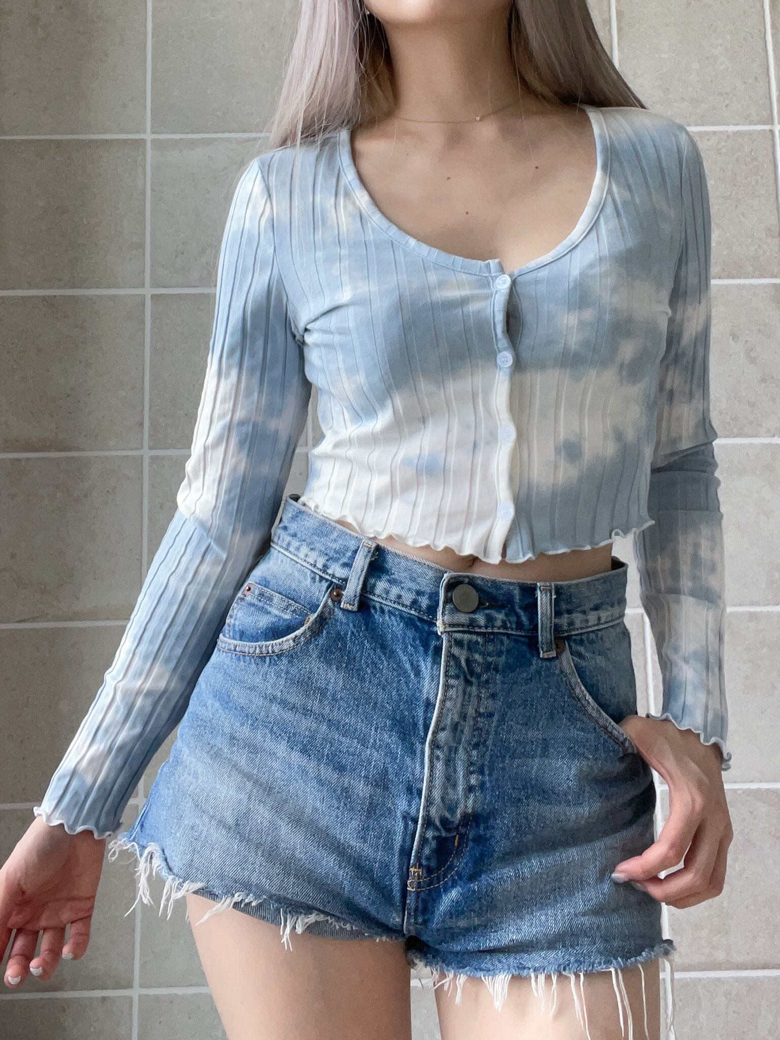 タイダイ柄 ショート丈リブカットソー 海外Sサイズ くすみブルー 水色 コットン 手染め 一点もの 長袖 ボタン付き